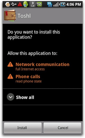To install any of those applications on your mobile device, click the Install button for that application. For example, if the RhoHub account has the external app Toshl, you can click its Install button in the RhoGallery apps list.